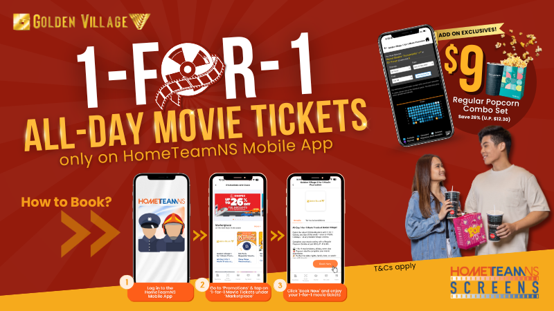 Enjoy 1-for-1 movie tickets from Monday to Sunday, including Eve of Public Holiday and Public Holiday, at all Golden Village Theatres. Book your ticket on the HomeTeamNS mobile app to enjoy the amazing privileges.